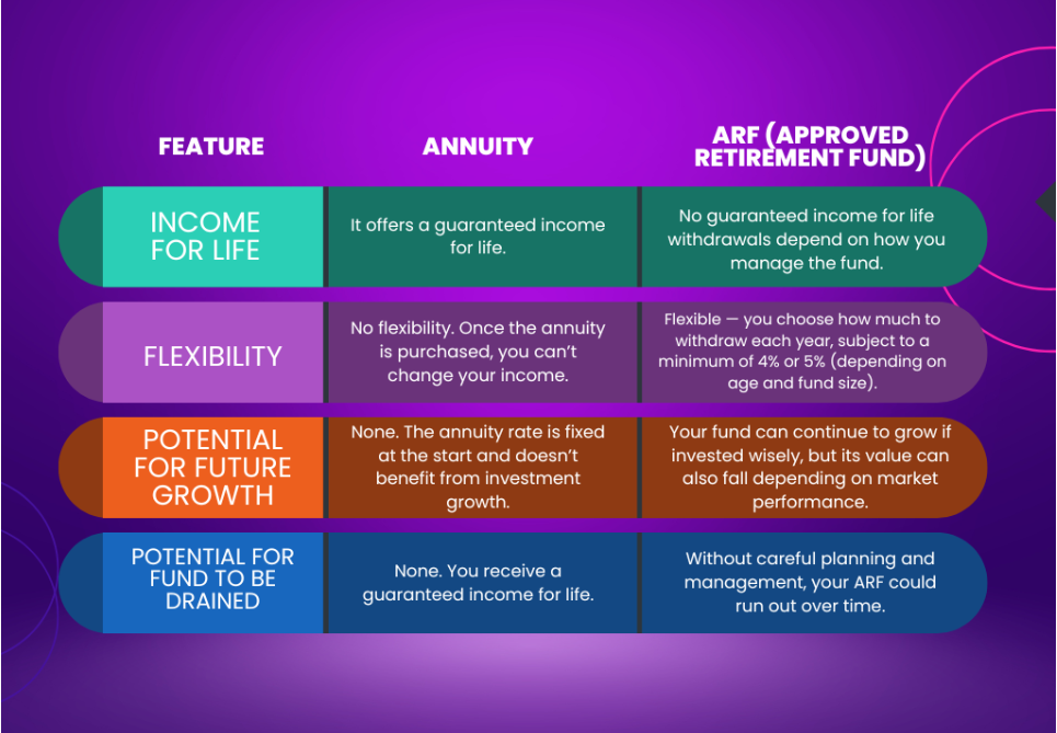 In short, if you prefer stability and certainty, an annuity might suit you. If you value flexibility and are comfortable managing some investment risk (with advice), an ARF could be the better fit.